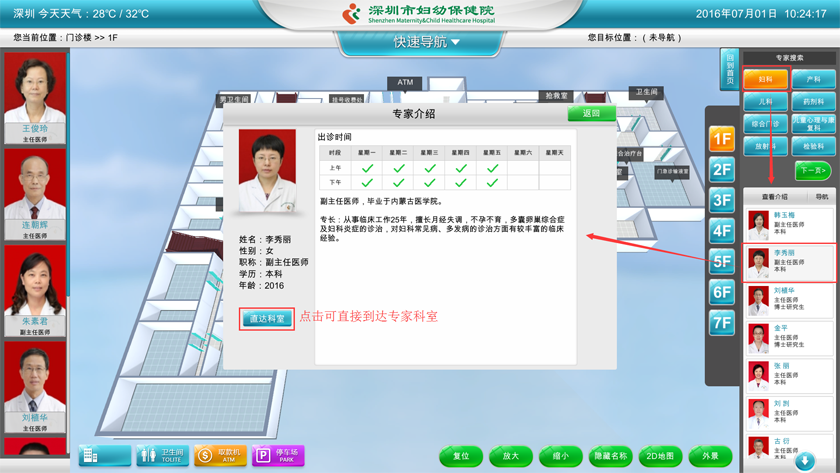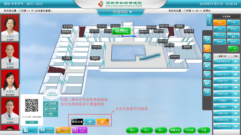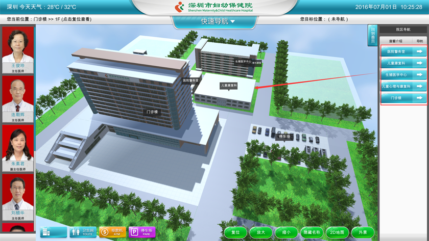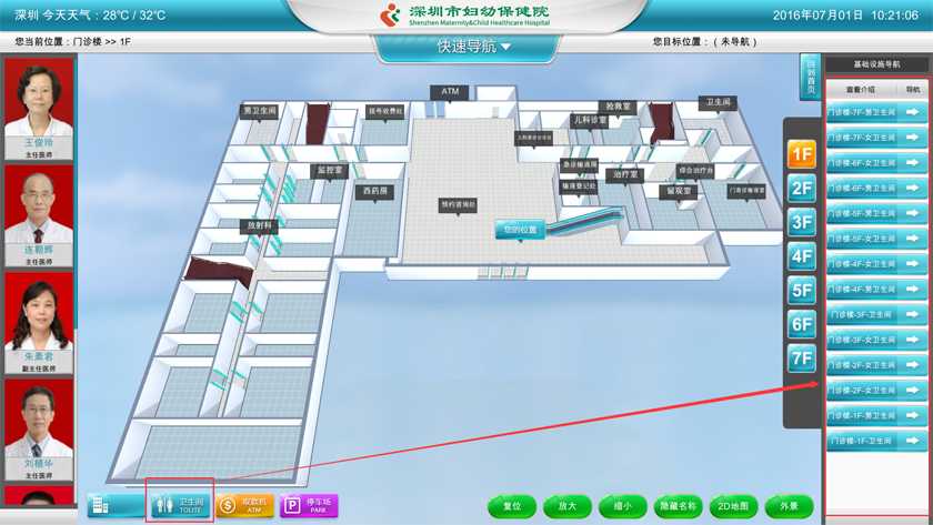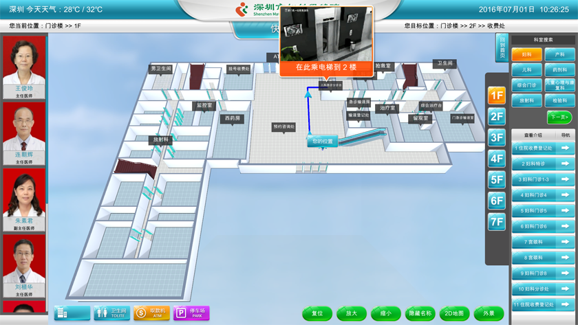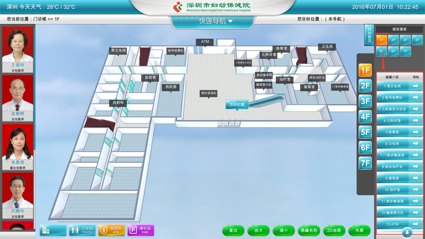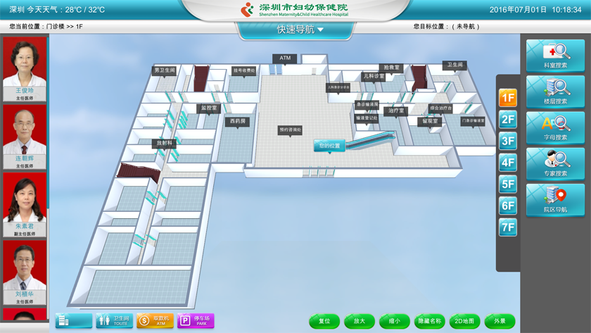 深圳市妇幼保健院使用的是直拓最新升级的SVE导航医院电子导航系统,系统由智能终端、触摸屏、液晶屏构成的一体化自助终端,该一体化自助终端内装有医院电子地图(或基本方位图),每一个终端都标有当前位置,患者根据液晶显示画面的提示,触摸屏幕来选择它所需要到达的位置,一体化终端便可显示出由当前位置到达目标位置的导航路径图。