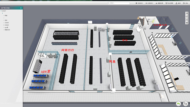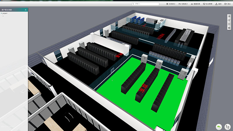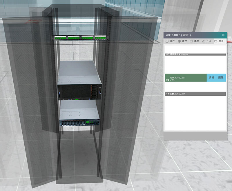 资产管理:实现在一个3d场景式的机房环境中一体化管理资产信息,包括:位置信息和容量信息等。