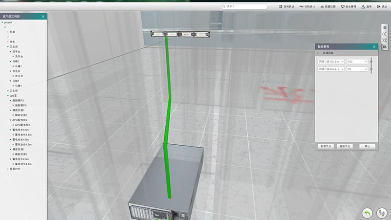 配线连接管理:实现机房中的设施设备端口之间通过走线架线缆连接以三维可视化形式管理。
