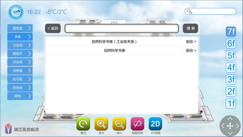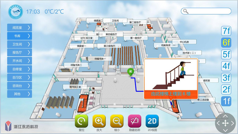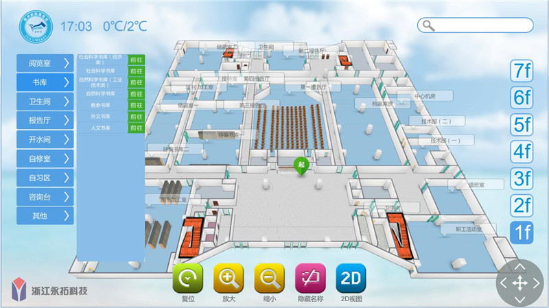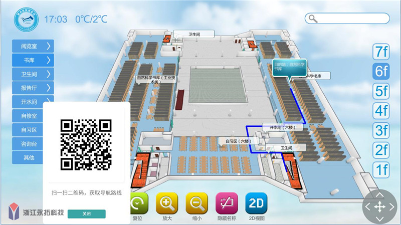 永拓科技EasyGo-3D室内导航软件结合校园图书馆管理系统可以实现书库位置准确定位。用户通过动态3D室内地图精准快速导航到图书馆的各个区域,或扫描触控一体机生成的二维码,获取路线导航指引和导航路线回放。