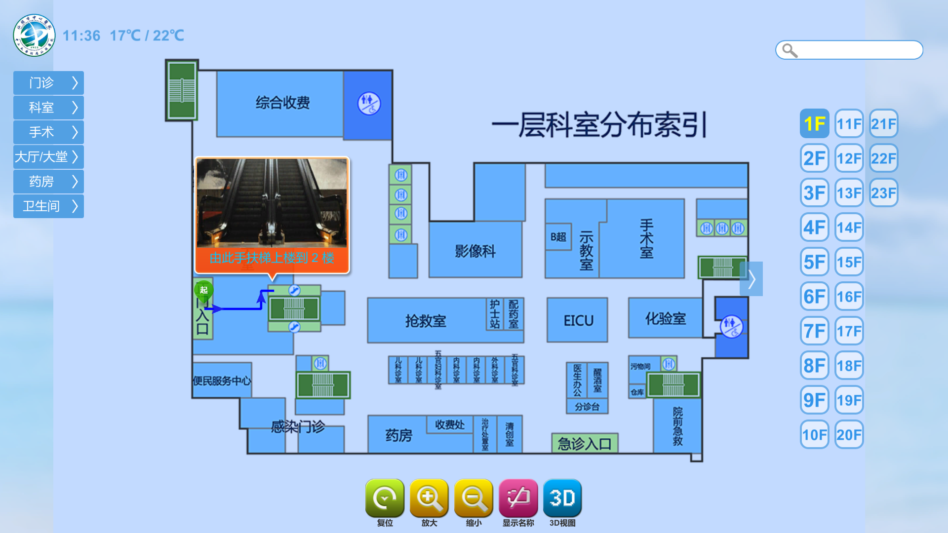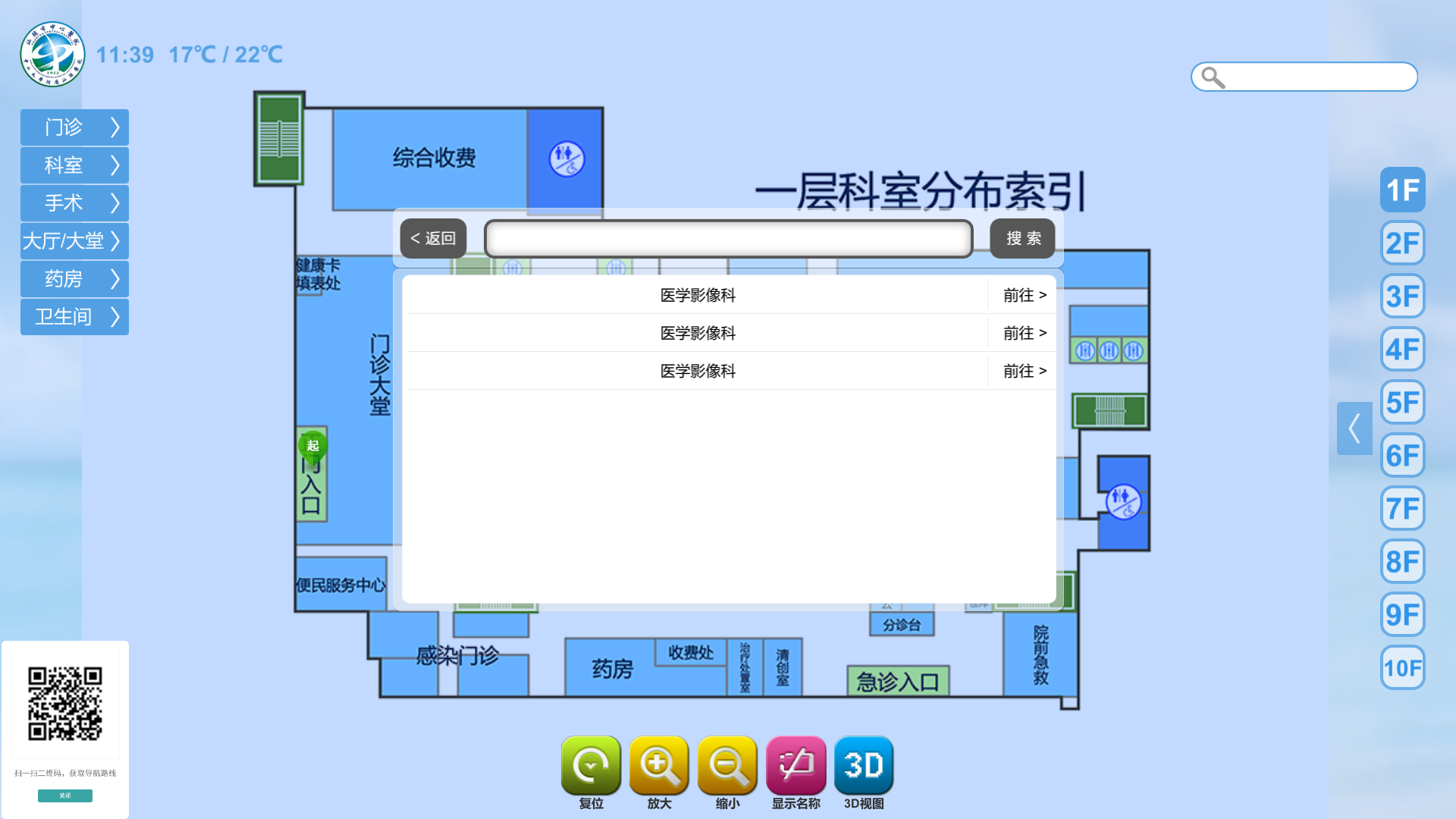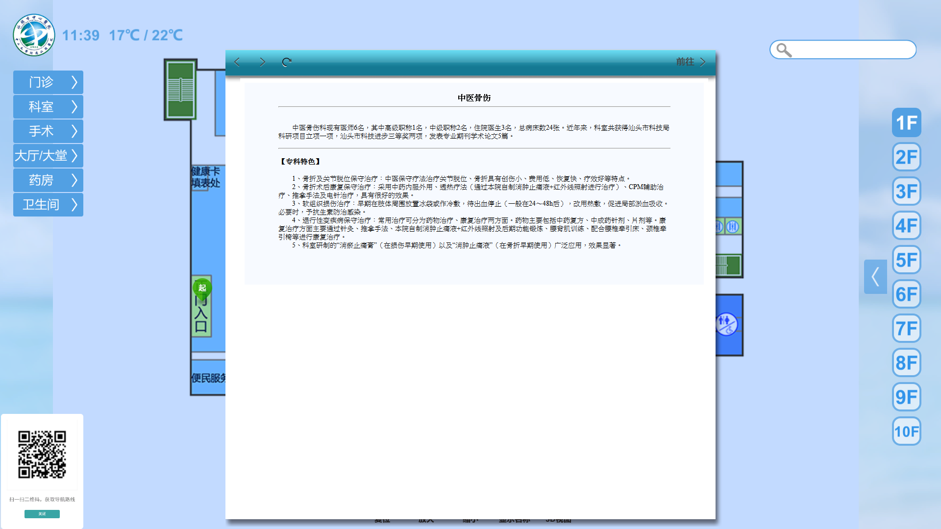 汕头中心医院室内导航终端是由本浙江永拓信息科技有限公司与广东航宇卫星科技有限公司合作利用本公司开发SVE进行制作完成的医院室内导航终端软件,方便用户在医院多媒体信息展示终端上,除了了解医院各方面信息咨询,也可以通过内嵌的SVE地图导航终端了解医院整体结构和布局,结合3D可视化仿真优势,能让用户快速掌握医院整体结构,在导航终端前,用户可以通过导航分类查找目的地,也可以通过搜索按钮快速搜索目标位置实现路线导航指引,路线导航结束后用户可以通过手机扫描二维码获取导航路线到手机终端。