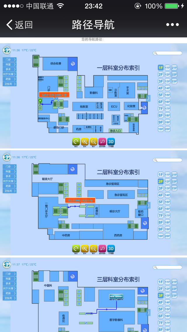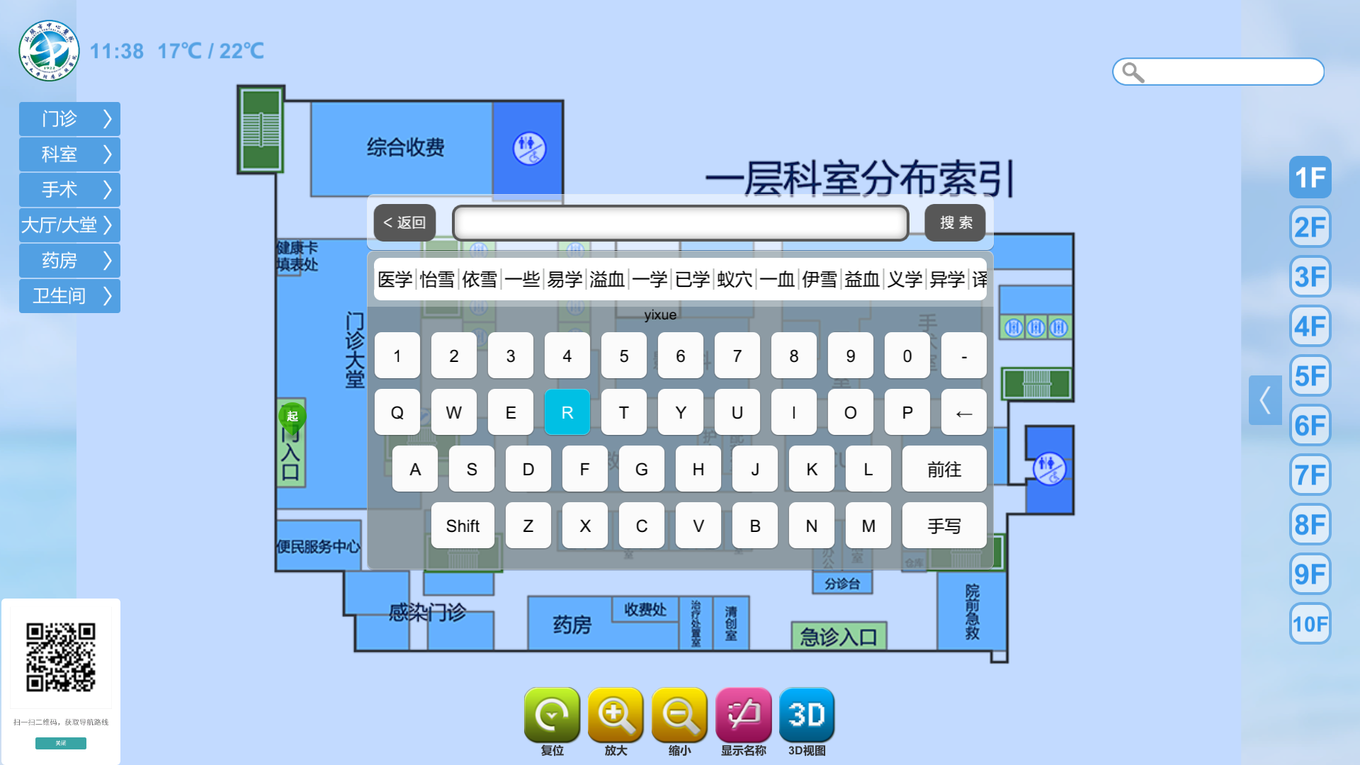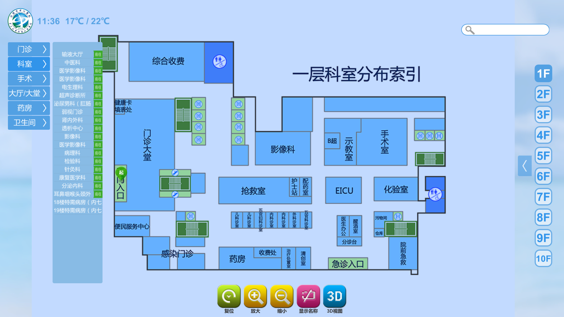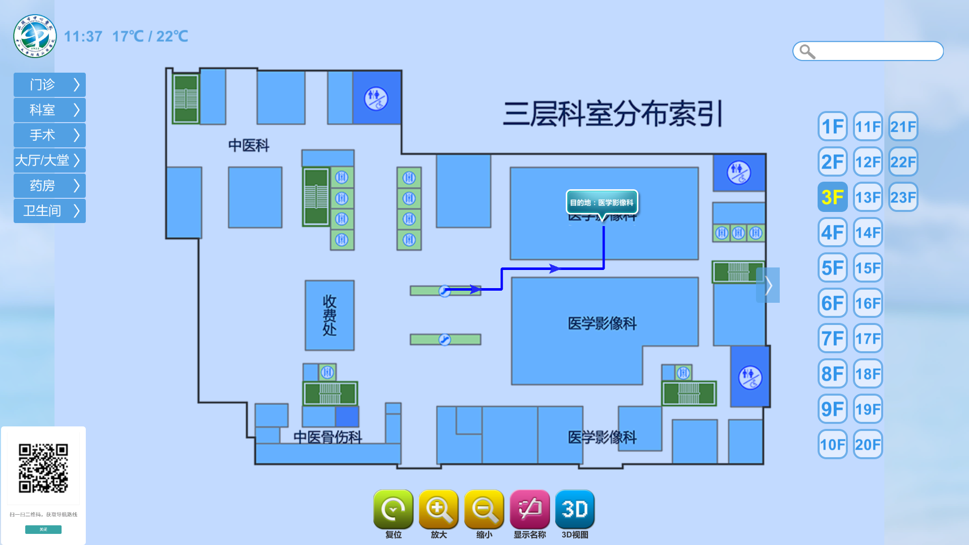 汕头中心医院室内导航终端是由本浙江永拓信息科技有限公司与广东航宇卫星科技有限公司合作利用本公司开发SVE进行制作完成的医院室内导航终端软件,方便用户在医院多媒体信息展示终端上,除了了解医院各方面信息咨询,也可以通过内嵌的SVE地图导航终端了解医院整体结构和布局,结合3D可视化仿真优势,能让用户快速掌握医院整体结构,在导航终端前,用户可以通过导航分类查找目的地,也可以通过搜索按钮快速搜索目标位置实现路线导航指引,路线导航结束后用户可以通过手机扫描二维码获取导航路线到手机终端。